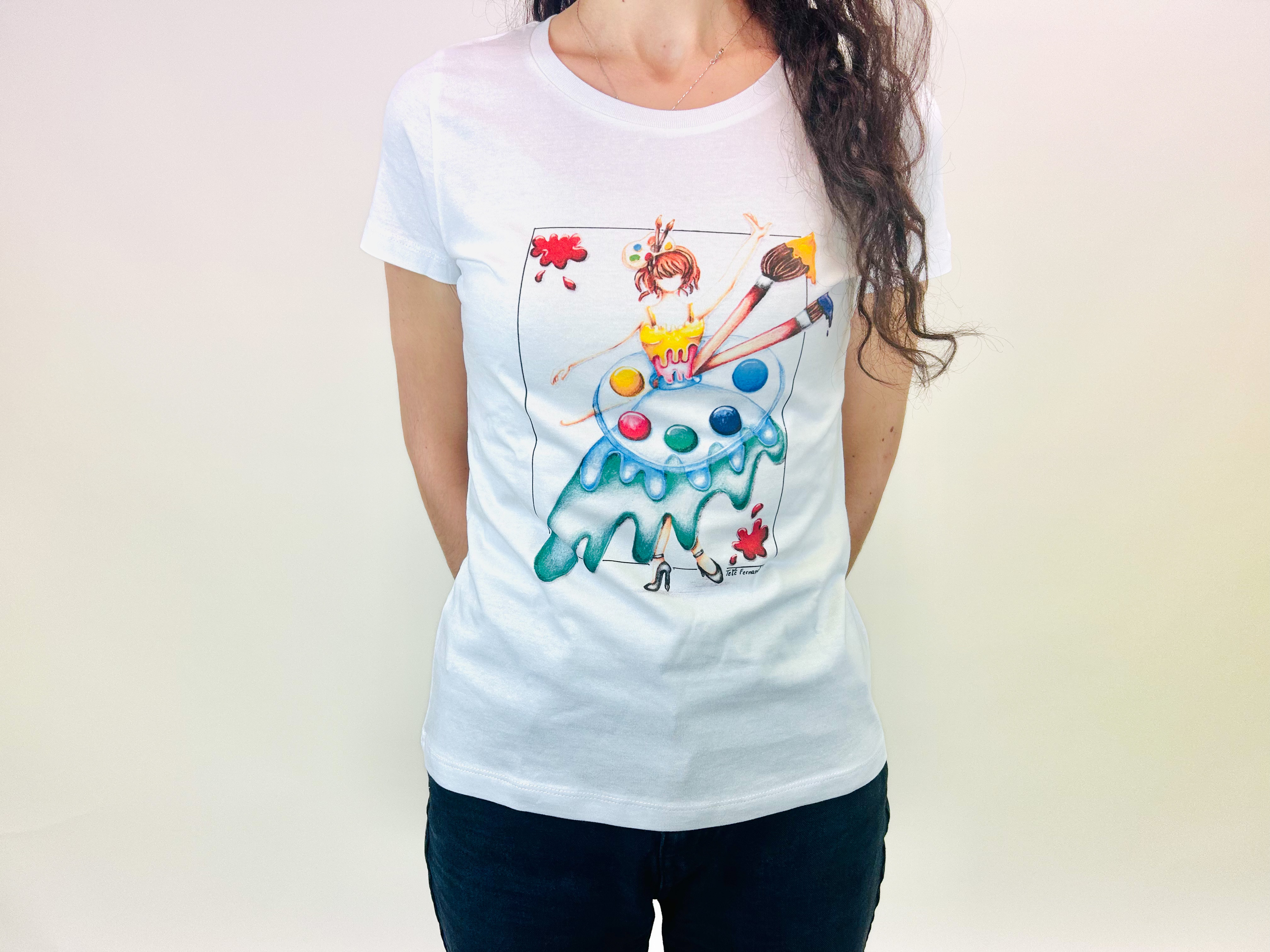 Caratterizzata da una fantasia vivace e originale che celebra il mondo della pittura con un tocco giocoso, questa t-shirt è l'ideale per aggiungere un tocco di colore e personalità al tuo guardaroba.