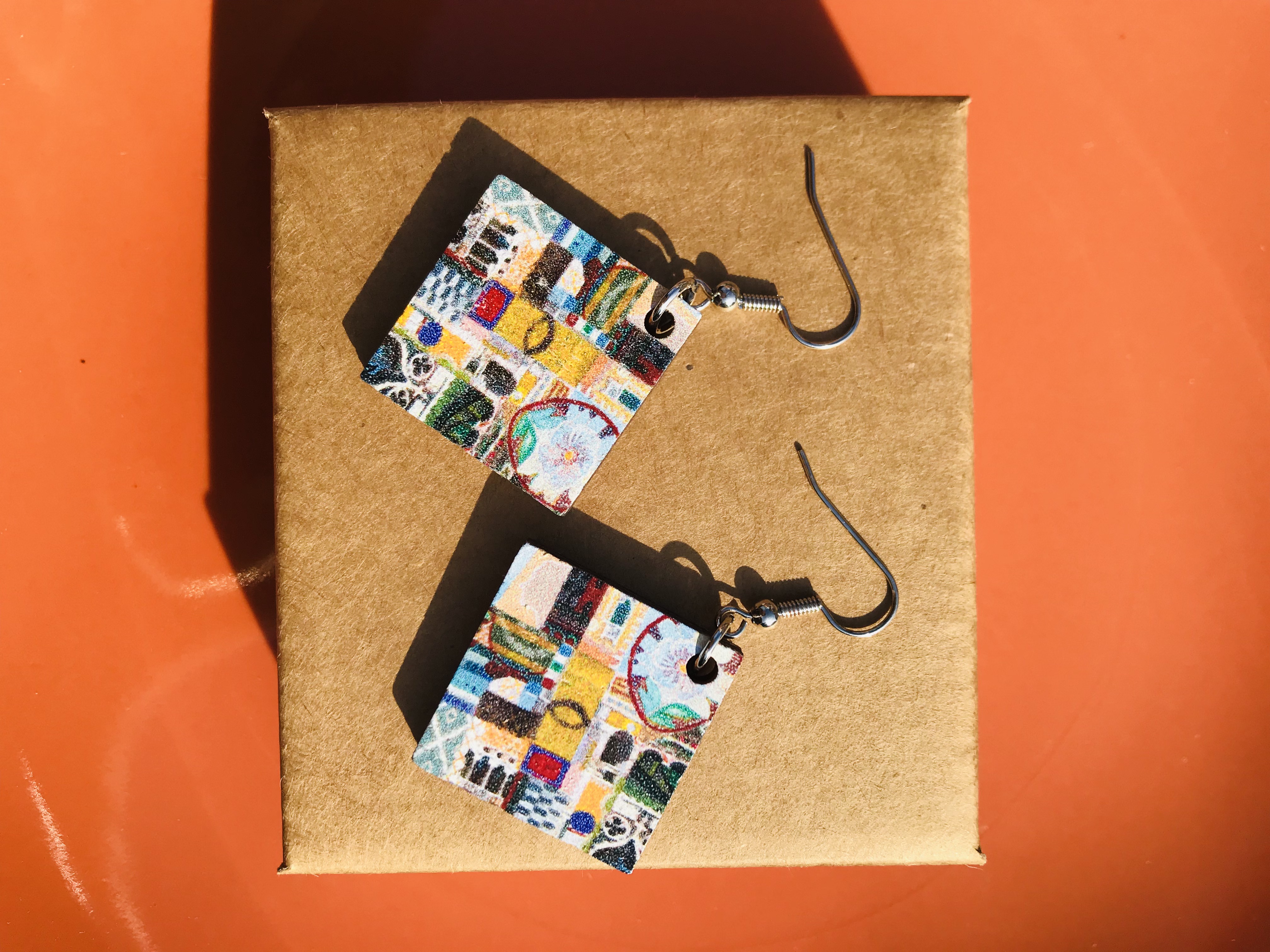 Questi orecchini leggeri e originali riportano un'opera dell'artista Eros Veronese, dove ogni impronta racconta un'emozione, una traccia, un gesto creativo irripetibile.