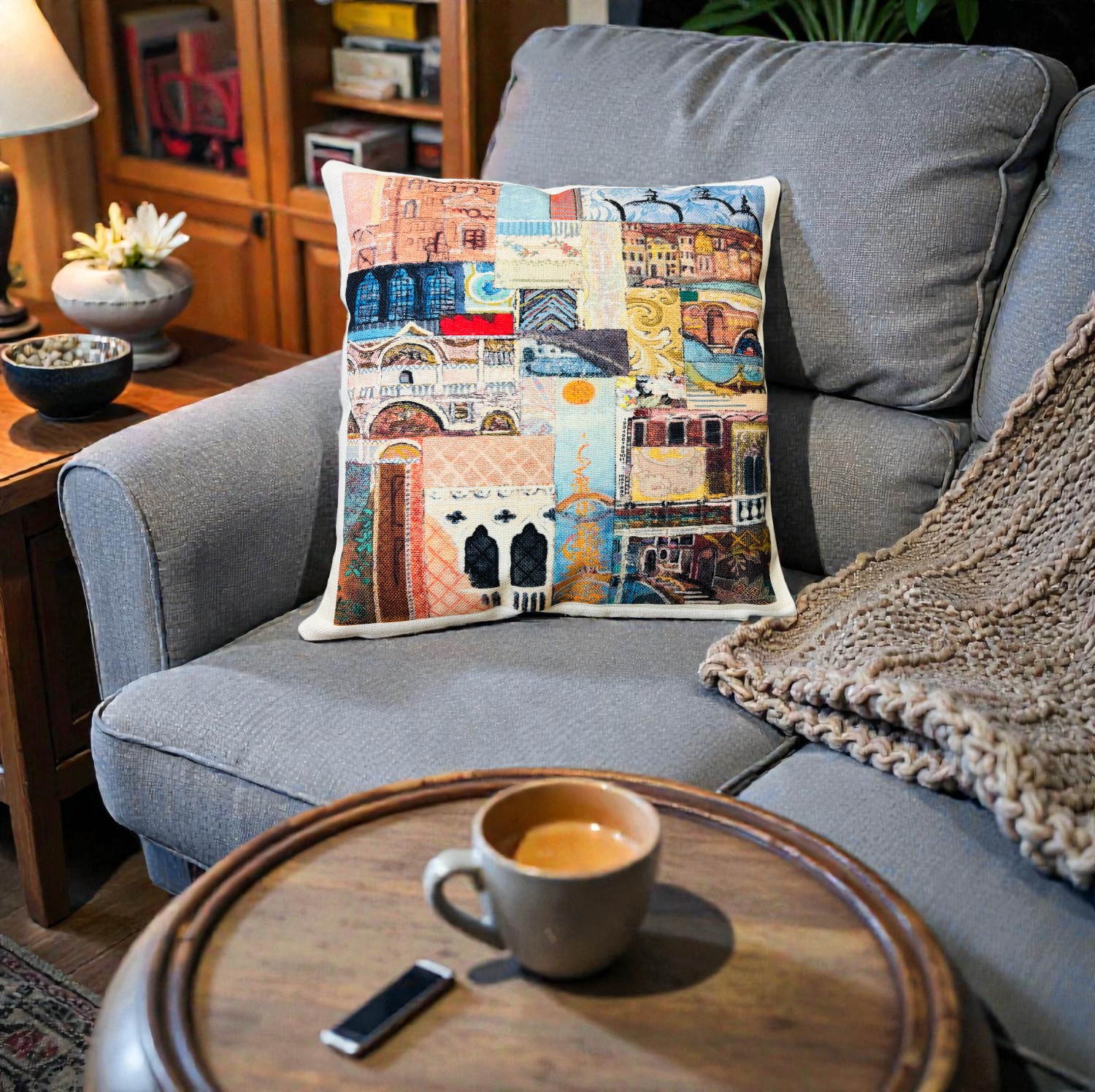 Questo cuscino 40x40 cm è un omaggio alla libertà visiva, caratterizzato da una complessa trama di architetture stilizzate, archi e motivi geometrici che creano un mosaico cromatico unico e vibrante.