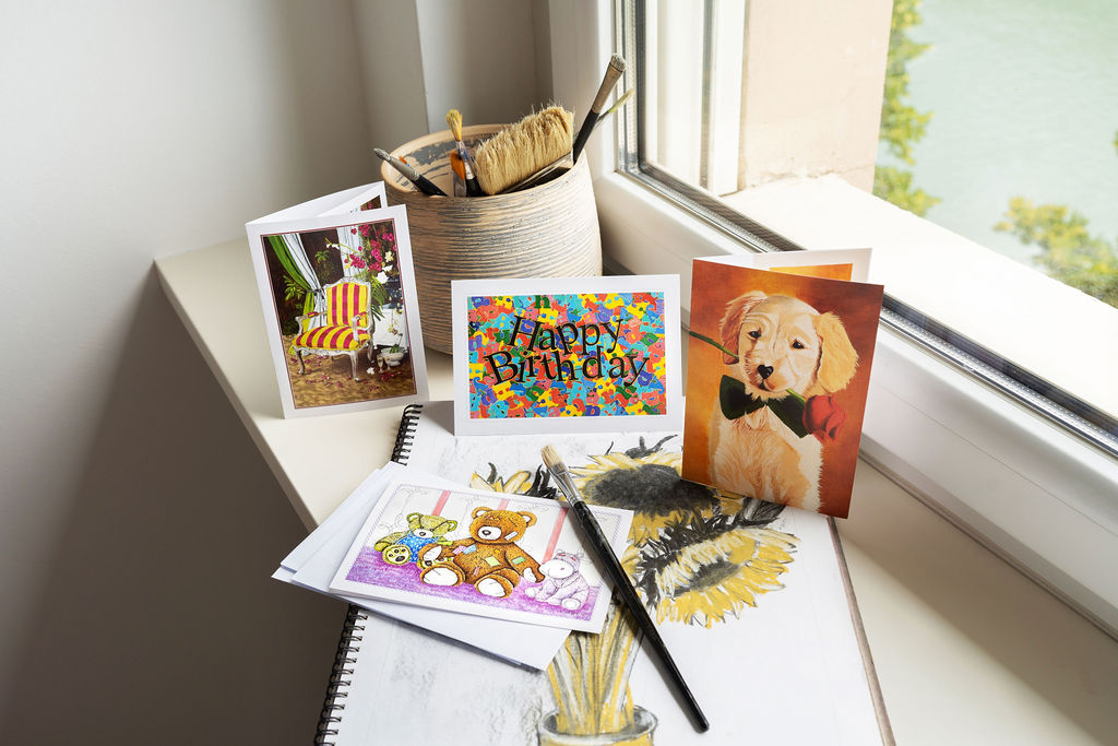 I biglietti di auguri AbilityArt sono realizzati con le opere di artisti che hanno disabilità fisiche e che utilizzano la bocca e/o il piede per dipingere.