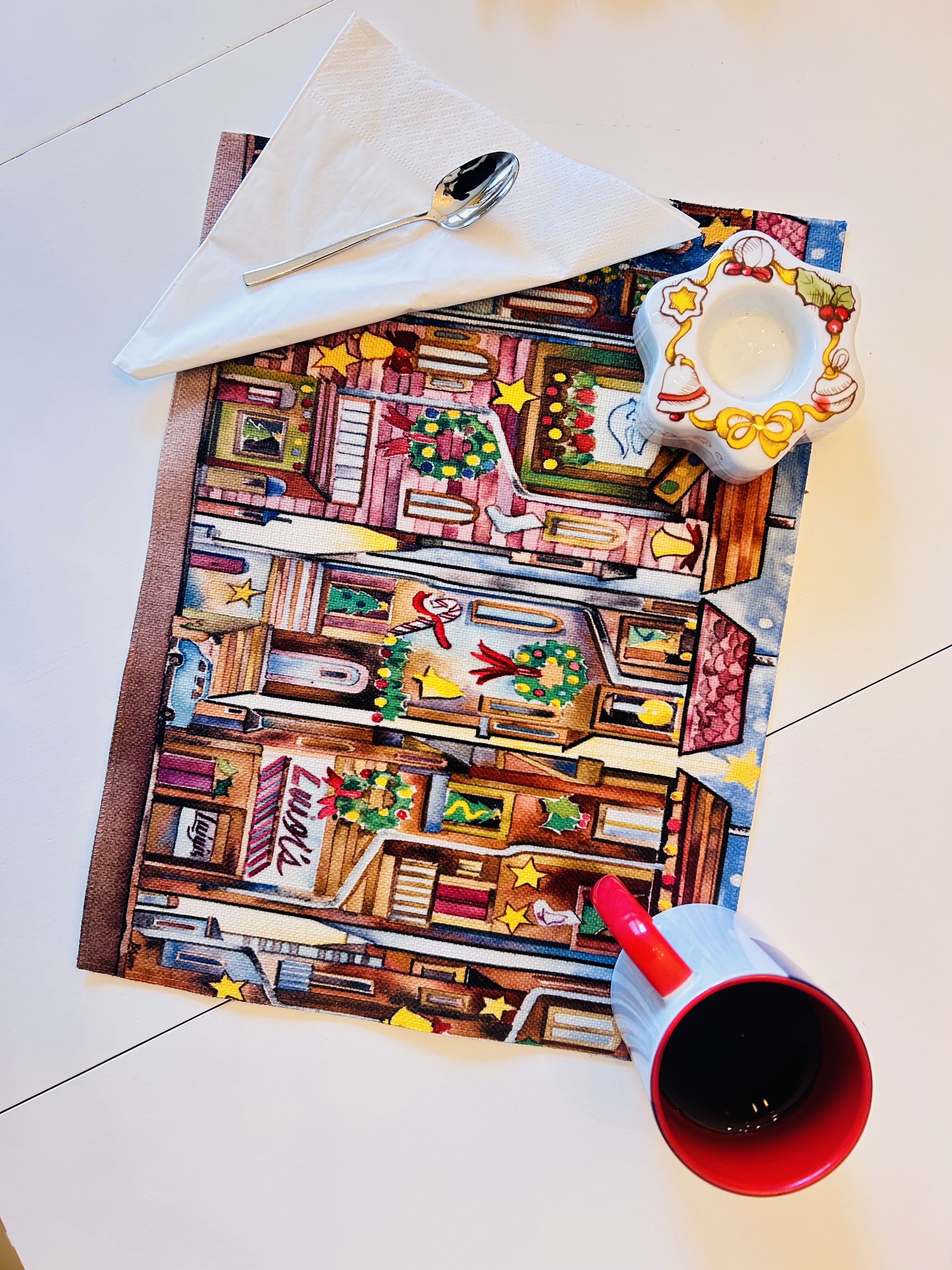 Tovaglietta Natalizia Facciata Casa Decorata: Porta la magia del Natale sulla tua tavola.