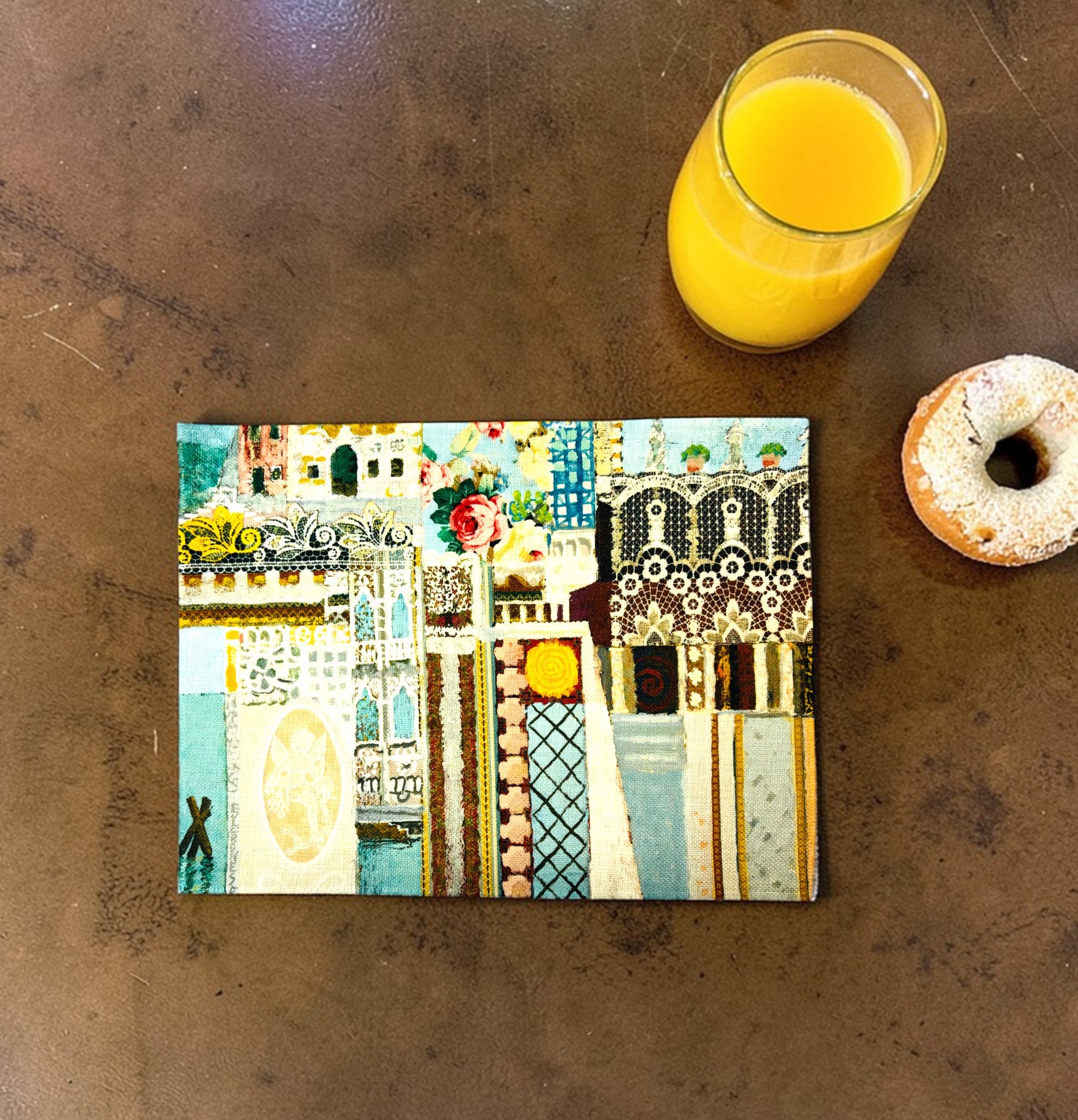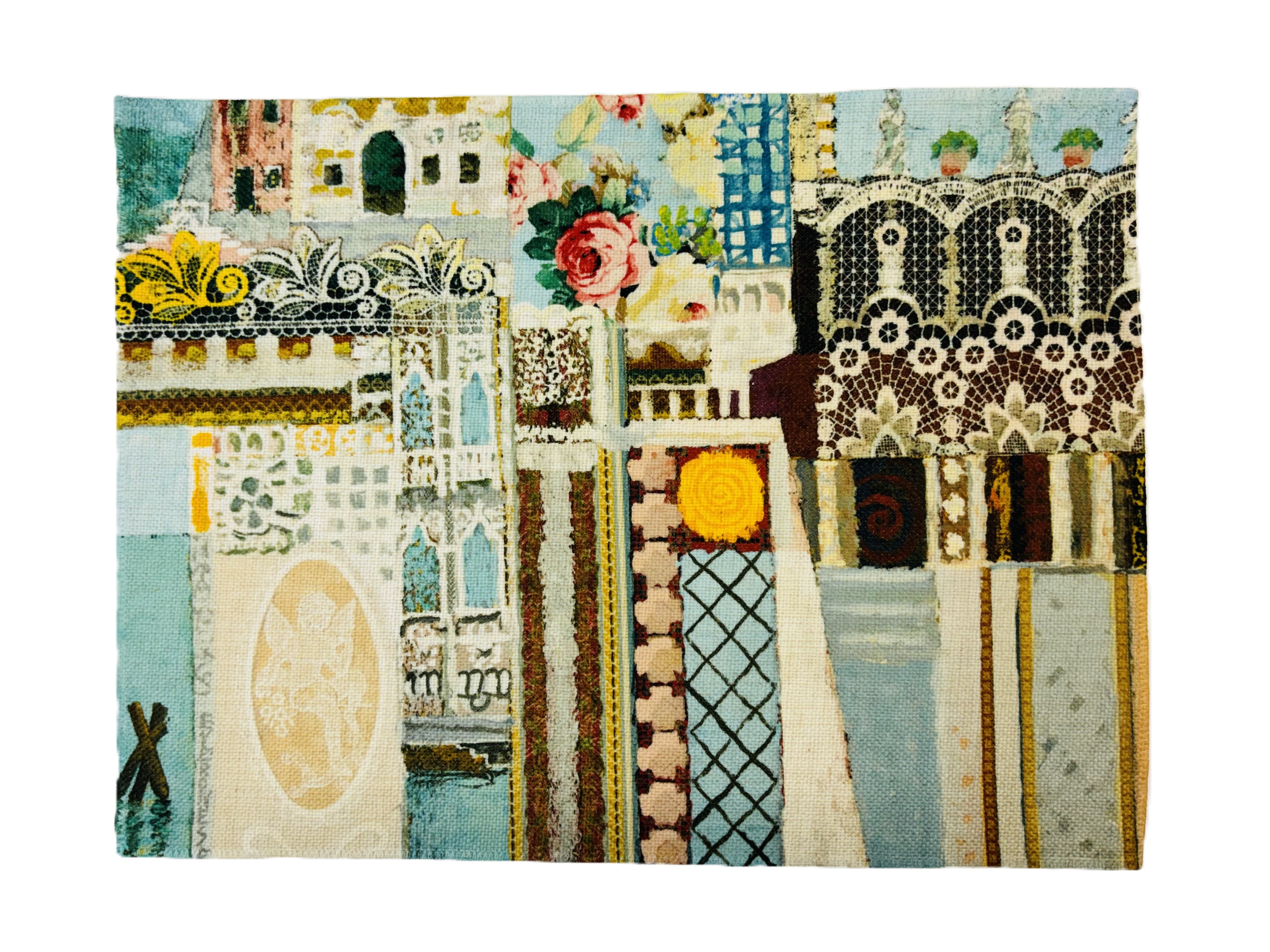Caratterizzata da una stampa artistica vibrante, questa tovaglietta si ispira alla complessità dei mosaici tradizionali, mescolando elementi architettonici, texture geometriche e palette cromatiche ricche.