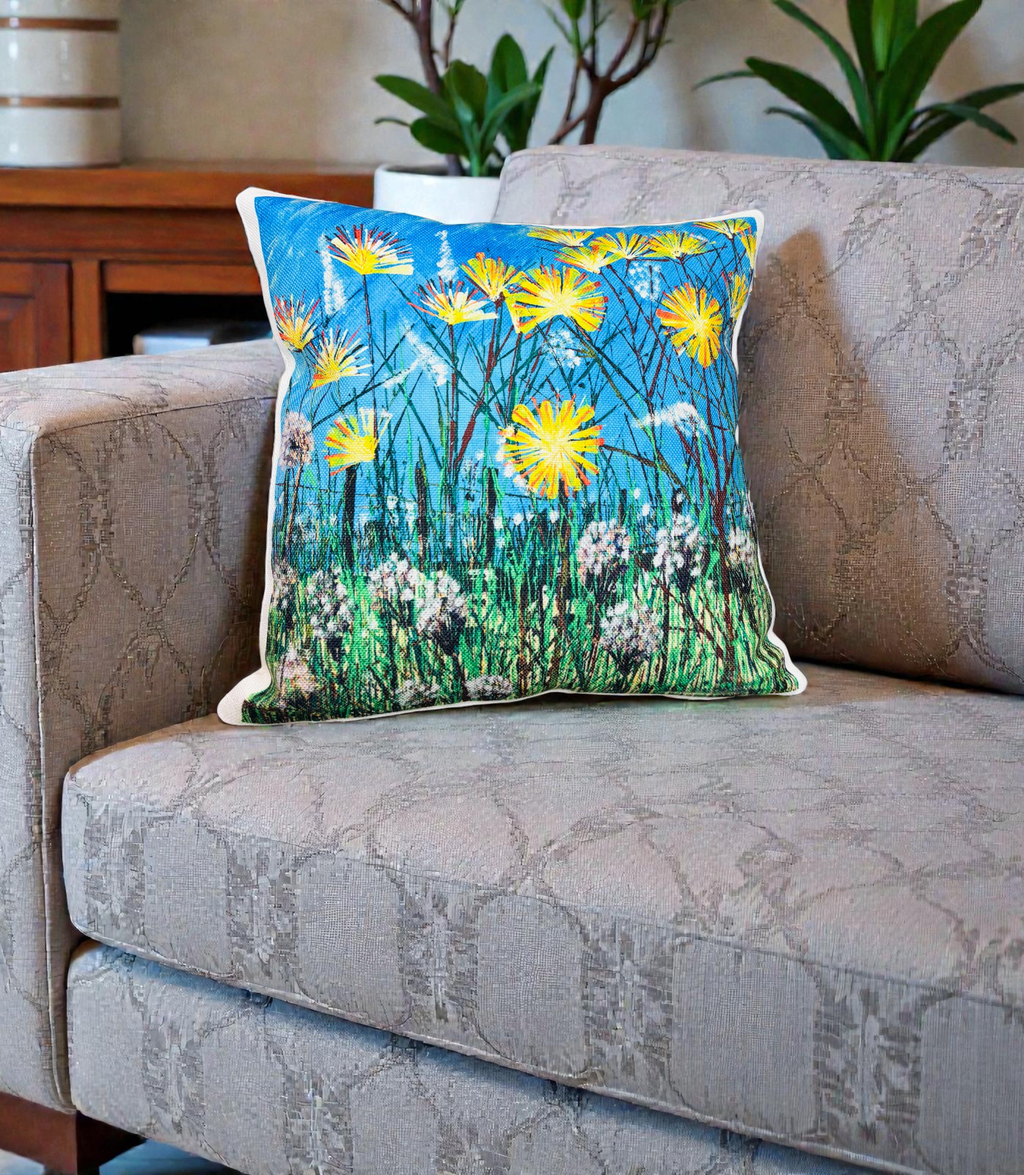 Trasforma il tuo divano in un angolo di natura con il Cuscino Prato con Fiori Gialli e Soffioni.