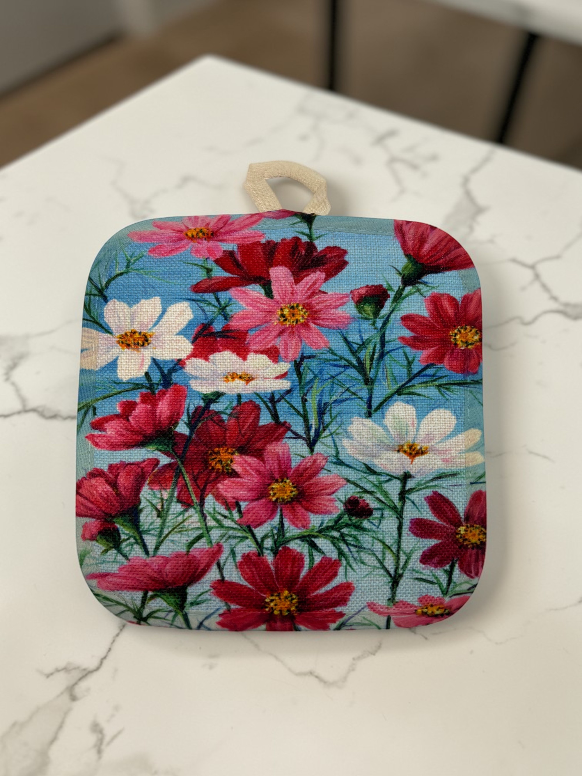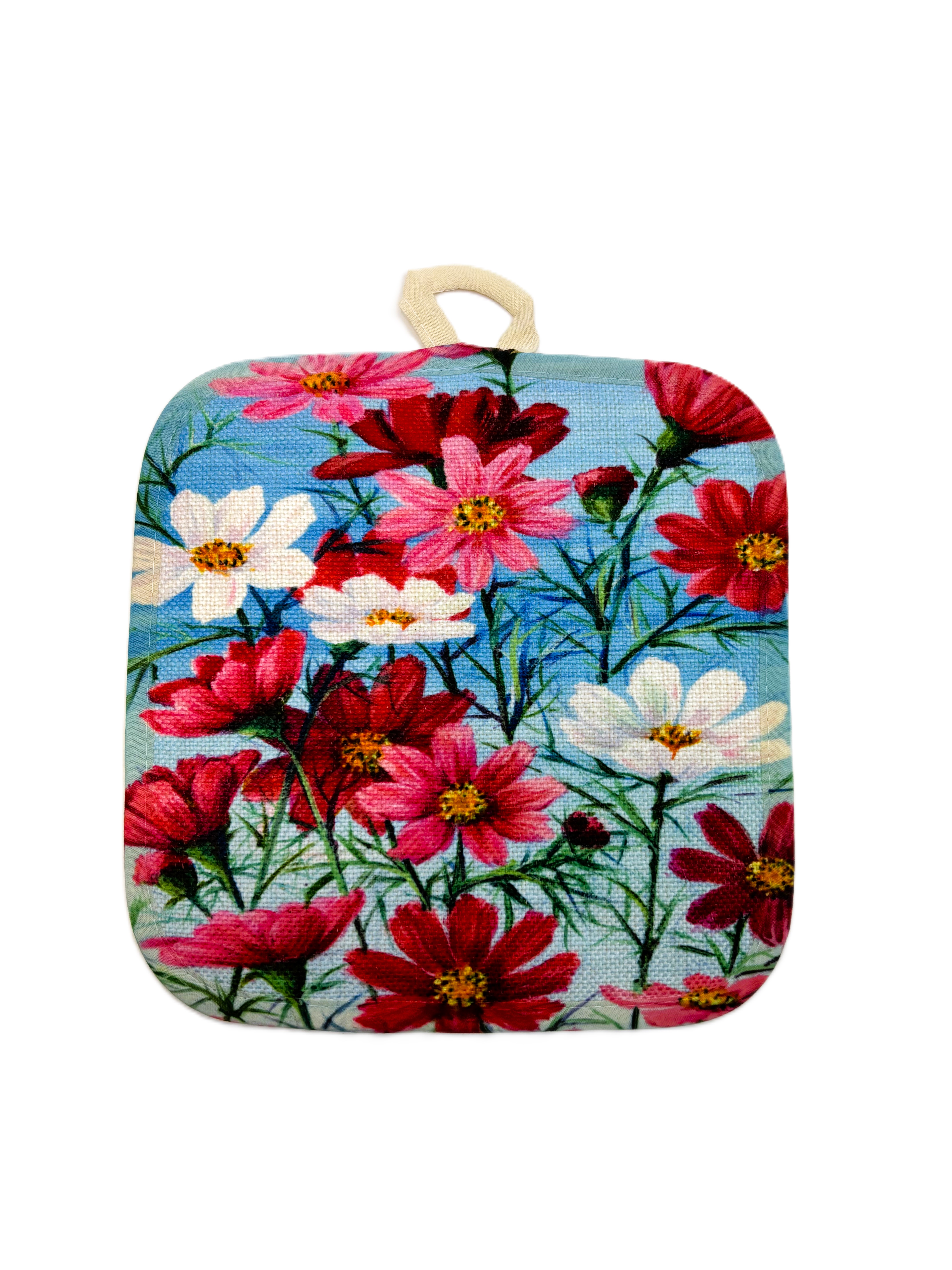 Caratterizzata da una stampa artistica vibrante su sfondo azzurro cielo, questa presina non è solo uno strumento di lavoro, ma un vero elemento d'arredo che celebra la bellezza dei prati in fiore.