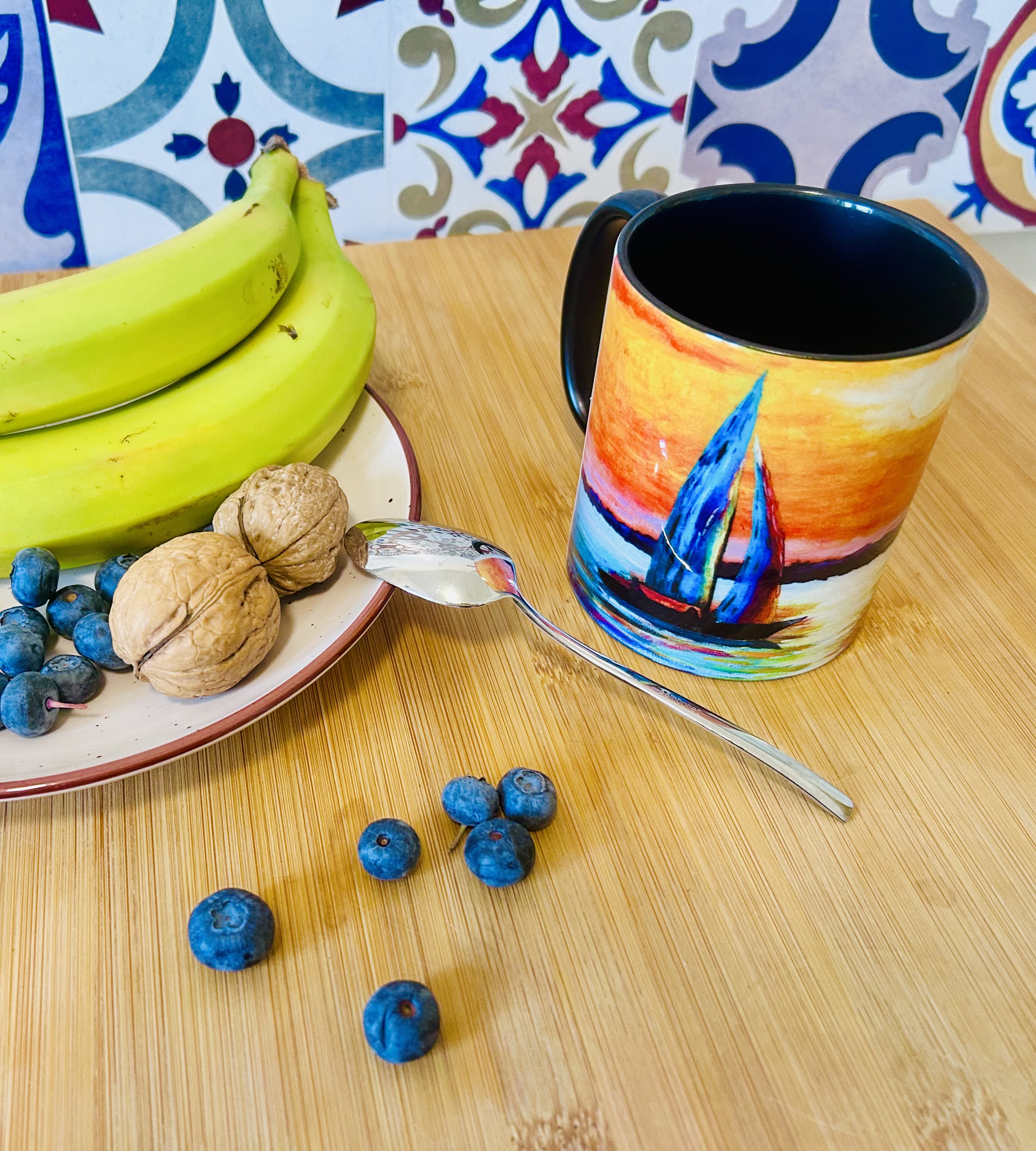 Questa tazza cattura i colori intensi e caldi di un paesaggio marino al calar del sole, con una suggestiva barca a vela che solca le onde.