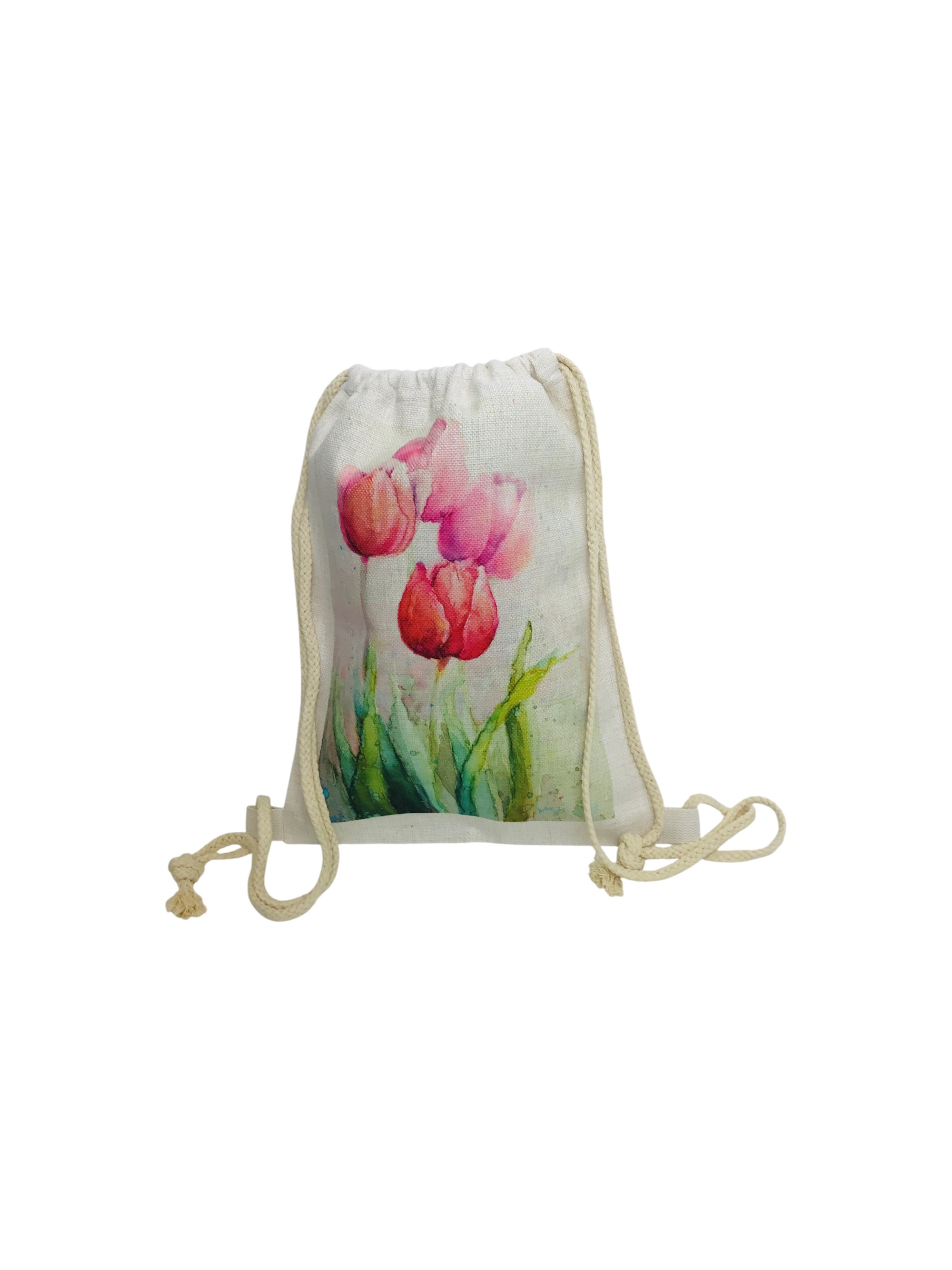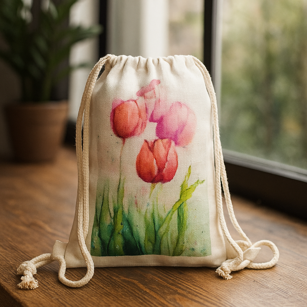 La stampa artistica con tre tulipani rosa e rossi dona un tocco elegante e femminile, mentre il tessuto in juta garantisce resistenza e autenticità.
